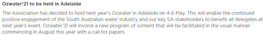 主办方最新消息,受到新冠肺炎疫情(COVID-19)的影响,2020年5月5-7日的澳大利亚水展将停办,2021年地点阿德莱德不变,时间为5月4-6日,敬请周知!2020年8月份开始提交会议论坛paper,同时展位图开放,即刻分配展位中!
